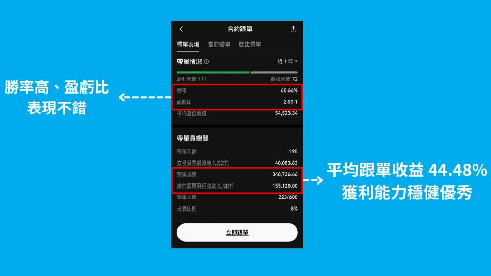- 胜率中下、盈亏比表现优秀:胜率较低,通常这类的带单员投资风格较激进,但追求较高的期望报酬。