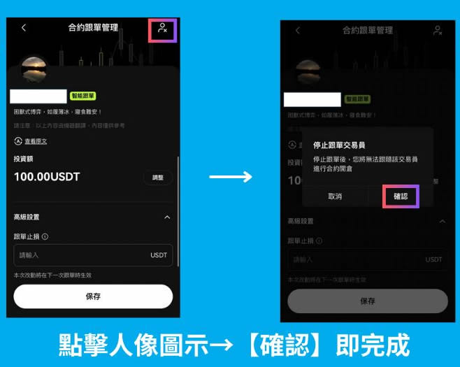 点击右上角人像图示→【确认】即完成okx 跟单取消