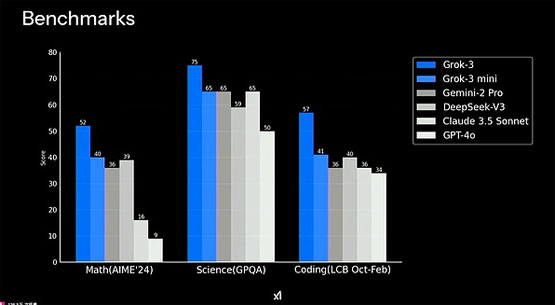 最新基准测试显示,grok-3在与deepseek的直接对比中展现出显著优势。