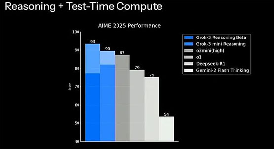 最新公布的aime 2025性能测试中,grok-3 reasoning beta版本在推理和计算时间复合评分上取得93分的优异成绩,其精简版本grok-3 mini也达到了90分。