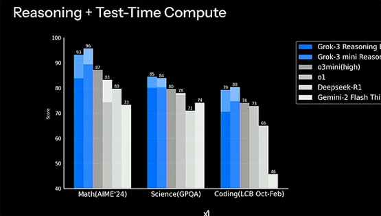 在数学推理中,grok-3获得93分,deepseek-r1为73分;科学推理中,grok-3得分85分,deepseek-r1为74分;编程推理中,grok-3达到79分,而deepseek-r1为65分。