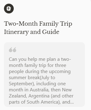 2025-03-09 10:08:20.080 | info | app.agent.toolcall:think:53 - ✨ manus's thoughts: it appears that the network issue is persistent and preventing us from using the google search function to gather information. in order to proceed with planning your trip, we can still make a general outline of what your two-month family trip might look like based on common itineraries for families visiting these destinations. once the network issues are resolved, i will be able to provide more detailed and personalized information.