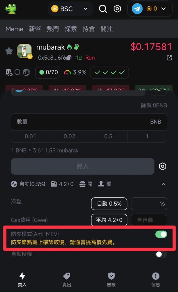 建议开启防夹模式,防止被机器人执行交易(攻击),推高你的购入价格