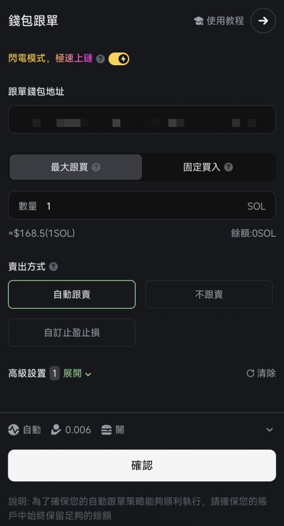 用户可以在网页直接点选跟单,或是透过 tg bot 输入钱包地址
