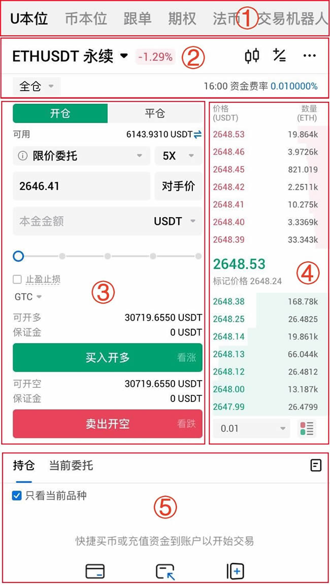 该部分是合约交易的操作区,包括开仓平仓选择、委托类型选择、交易数量等,输入交易信息后就可以下单了。