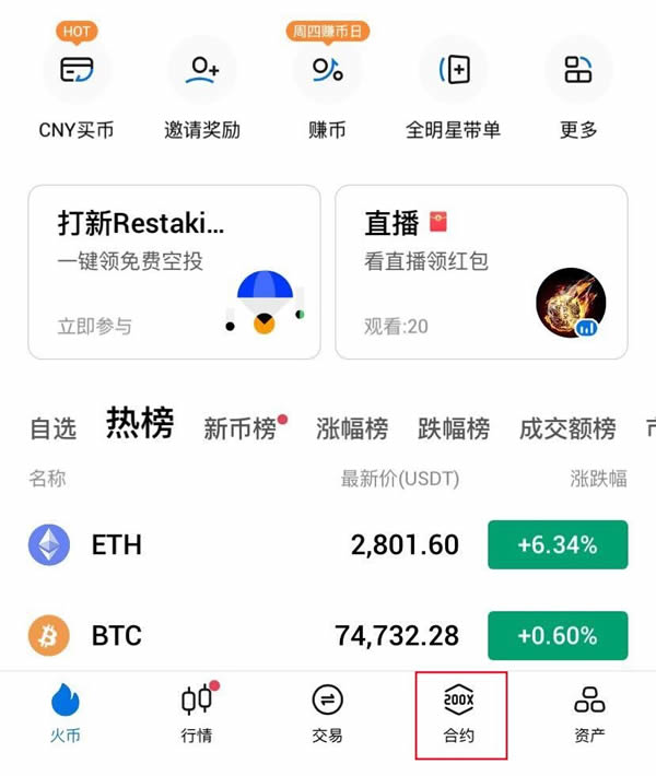1. 打开火币app(官方下载)并登录账号,点击下方的“合约”,进入合约交易页面。