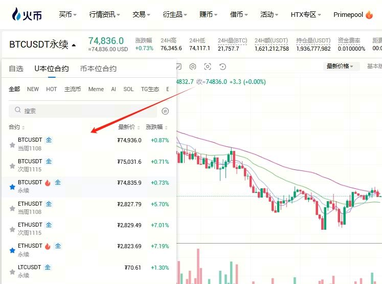 2. 鼠标悬停在左上角币对处,随后在弹窗中选择要交易的币对,如btcusdt永续。